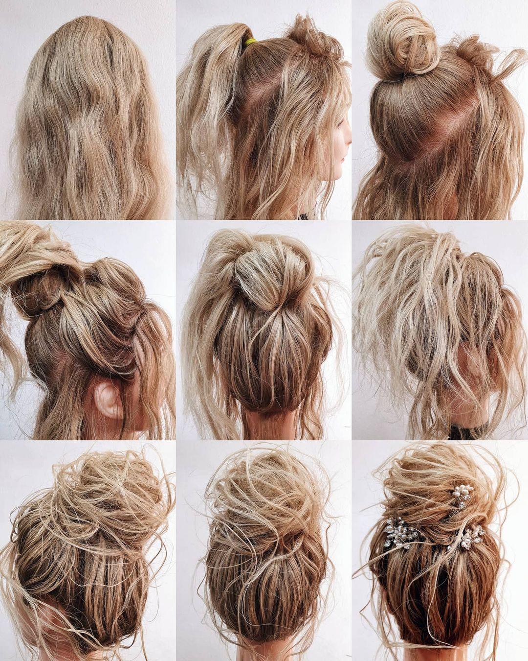 Прическа небрежный пучок на средние волосы