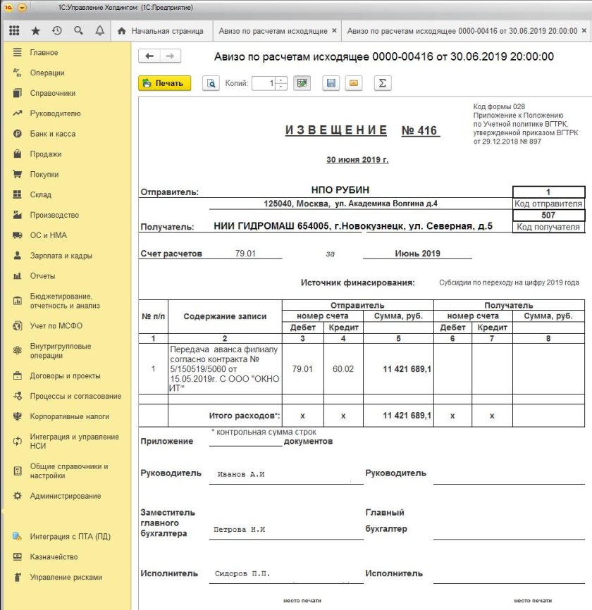 Авизо по ОС В 1с Бухгалтерия