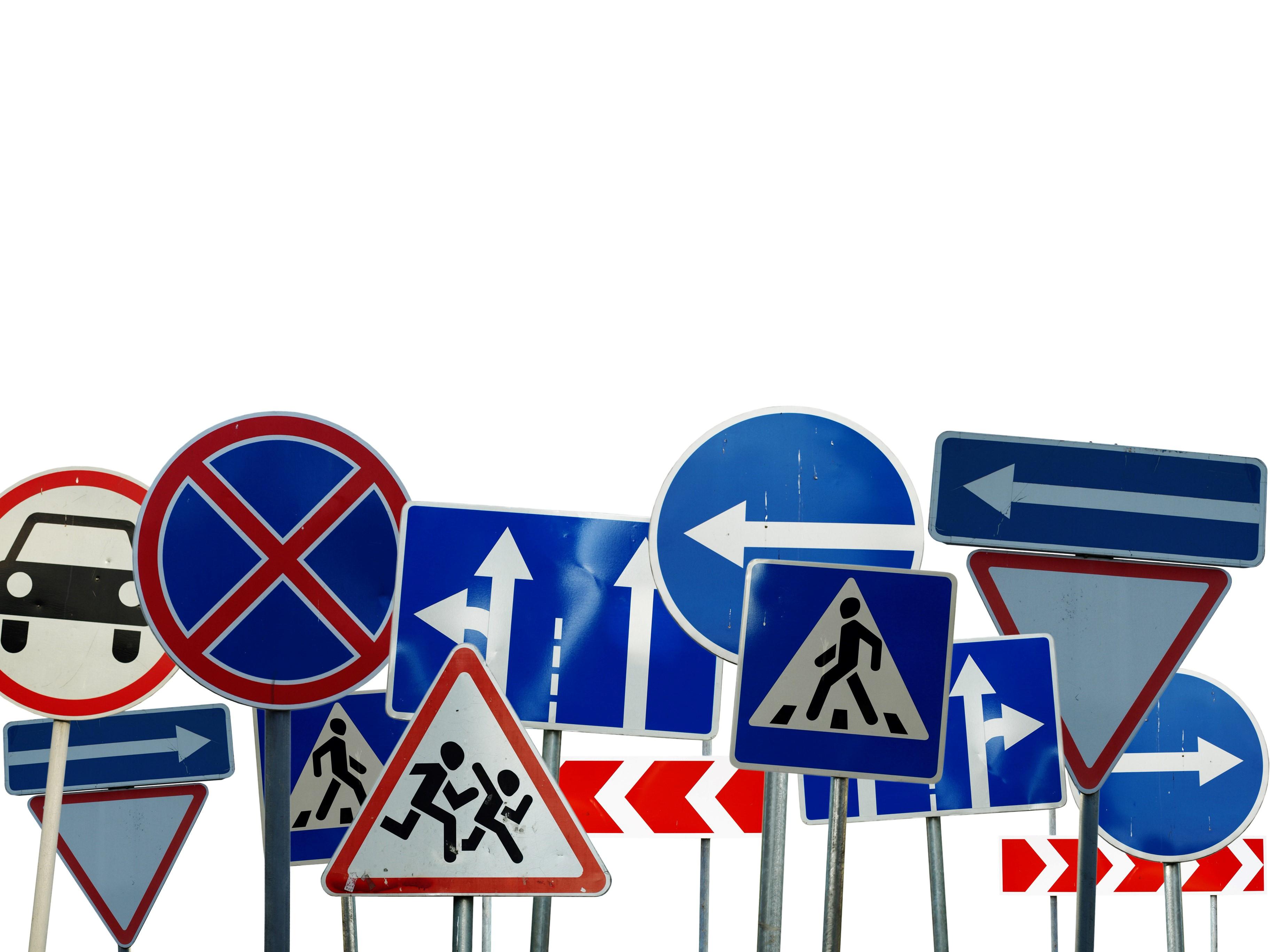 Много дорожных знаков на дороге