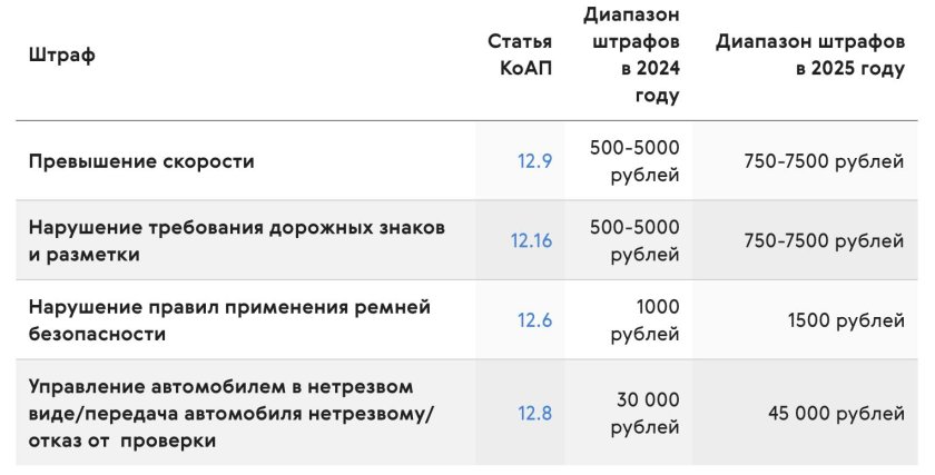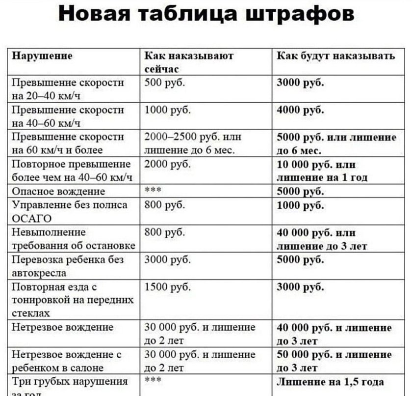 Новая таблица штрафов