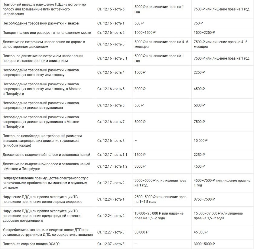 Таблица штрафов ГИБДД