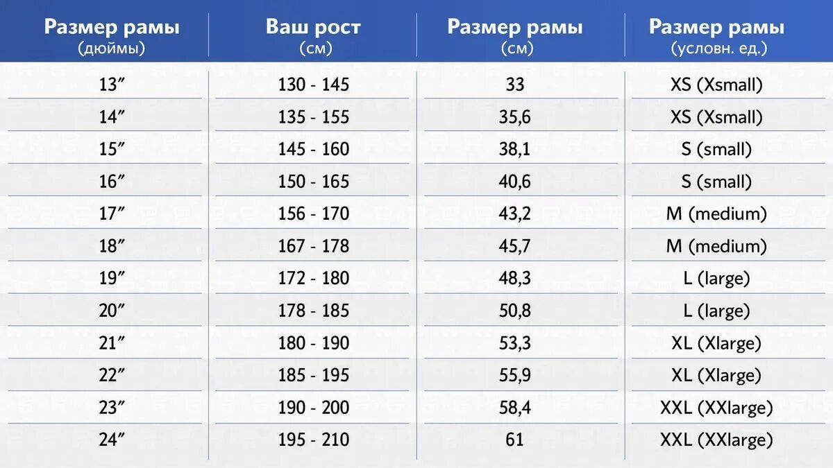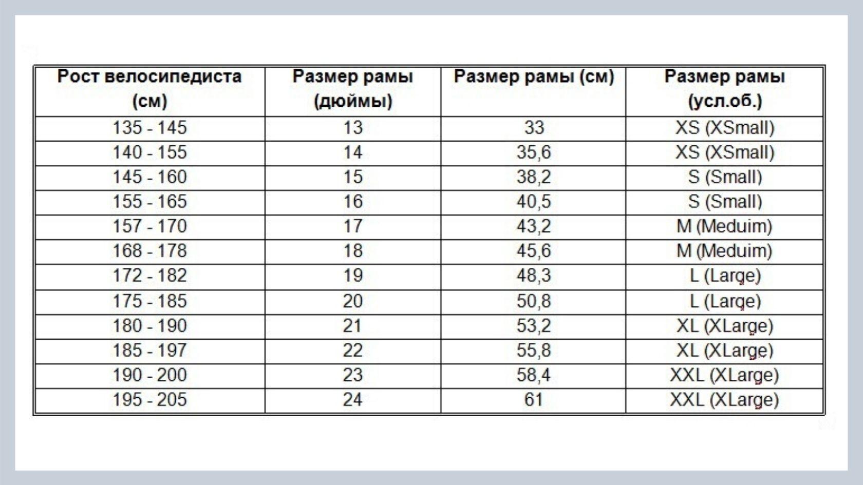Размер рам велосипедов по росту таблица