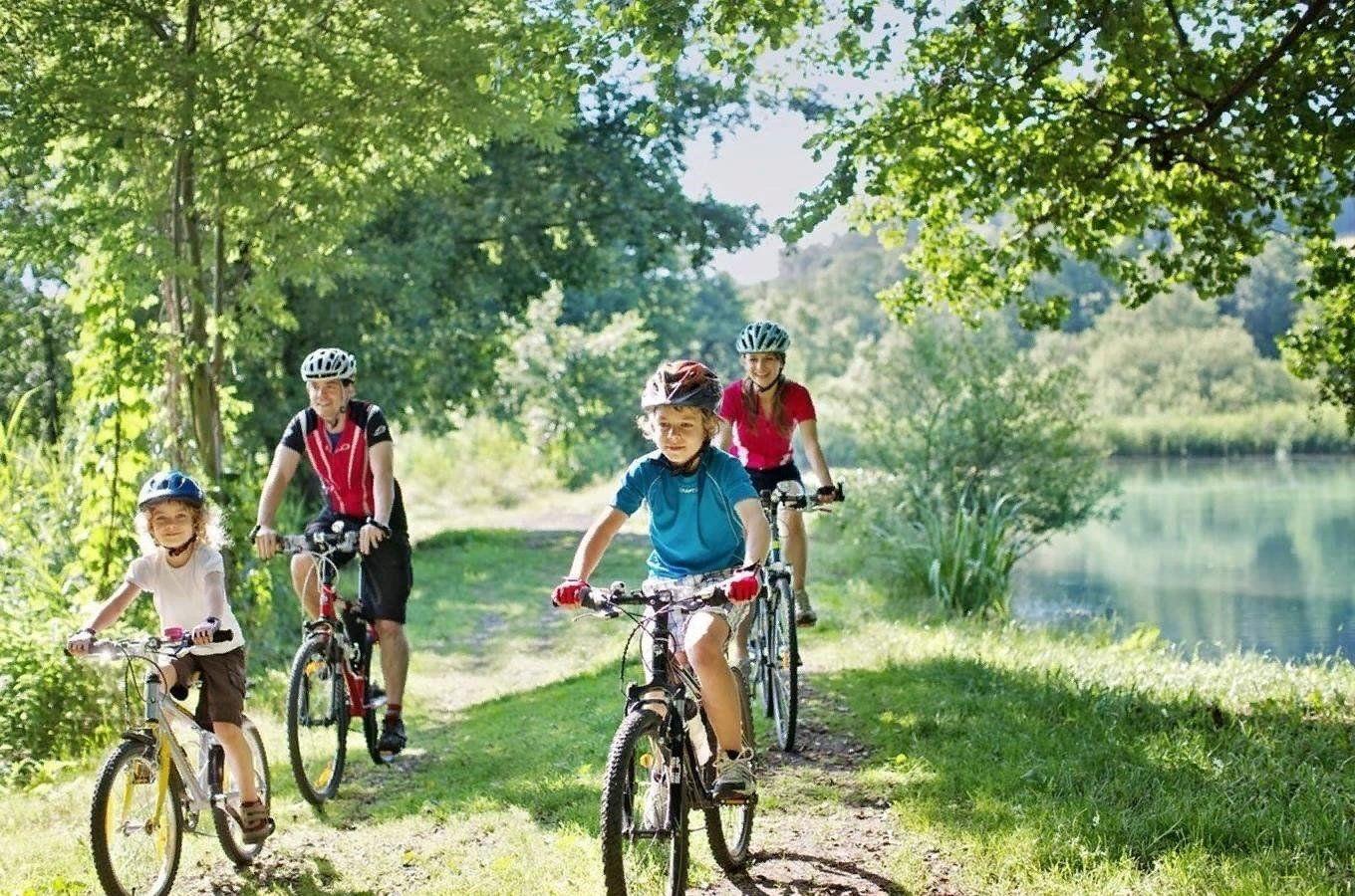 Ребенок с родителями на велосипеде природа лето
