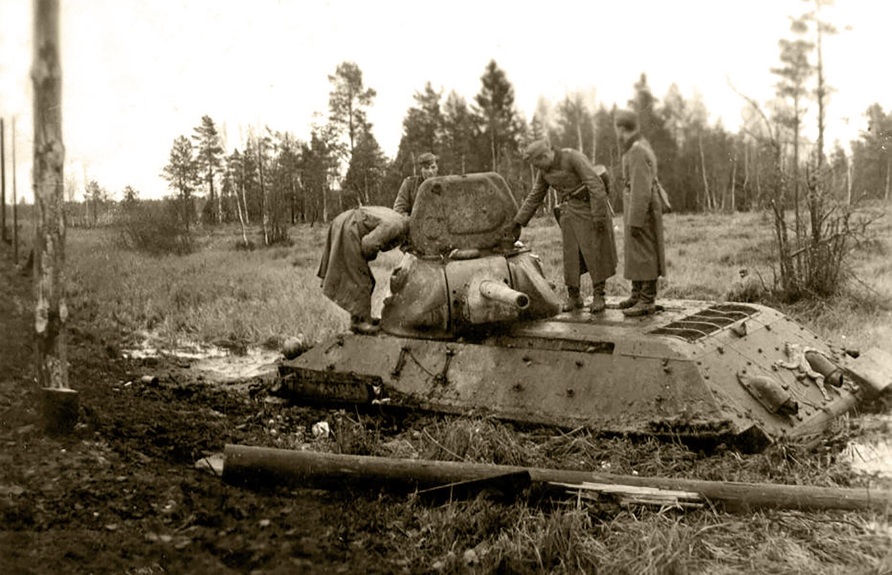 Немецкие солдаты осматривают подбитый т-34