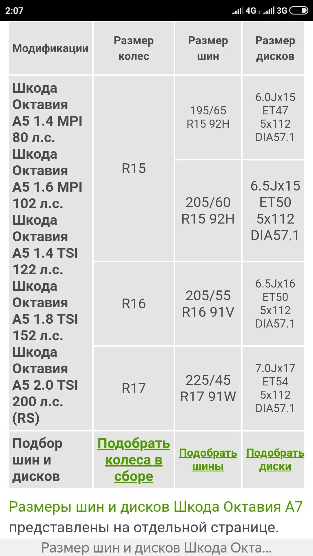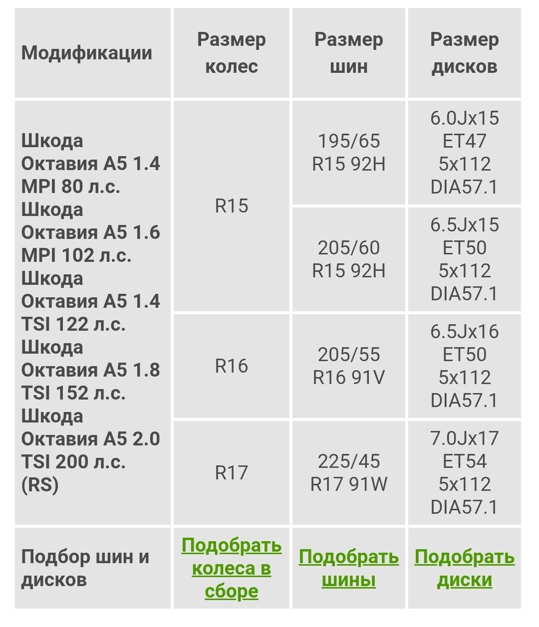 Размер колес Шкода Октавия а5