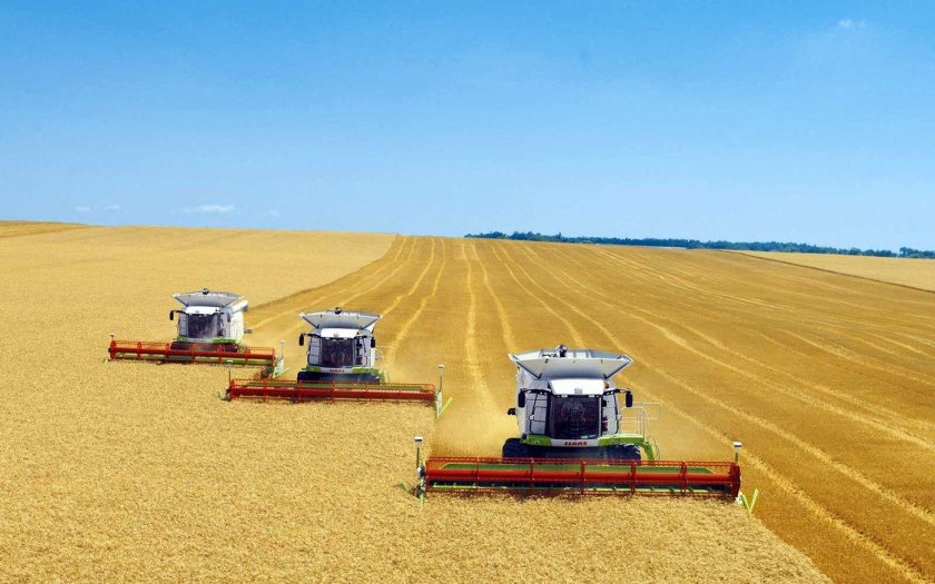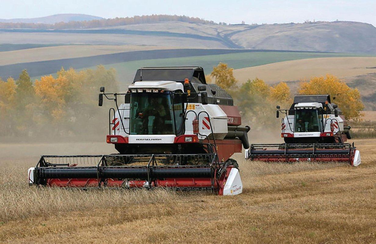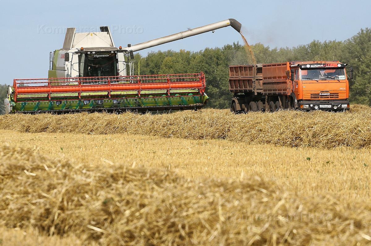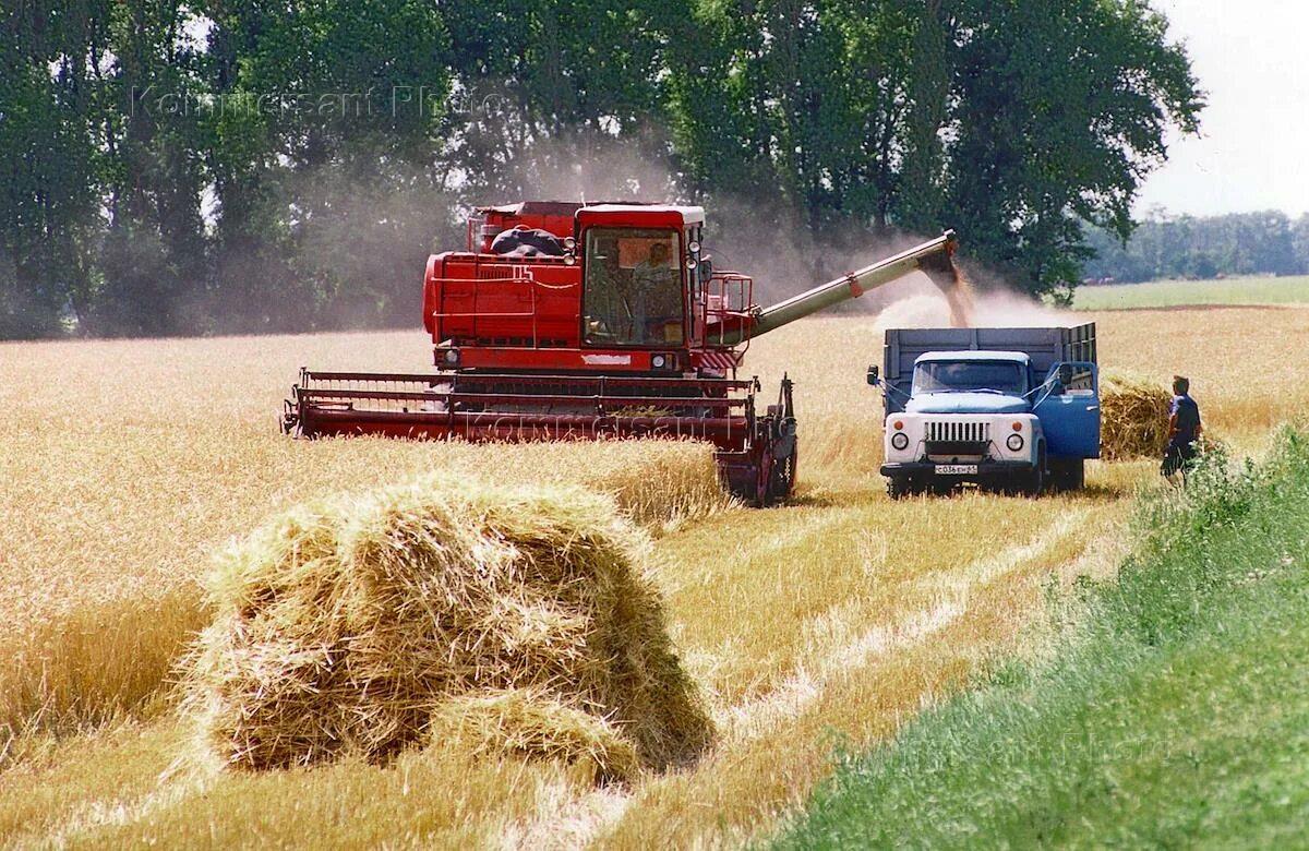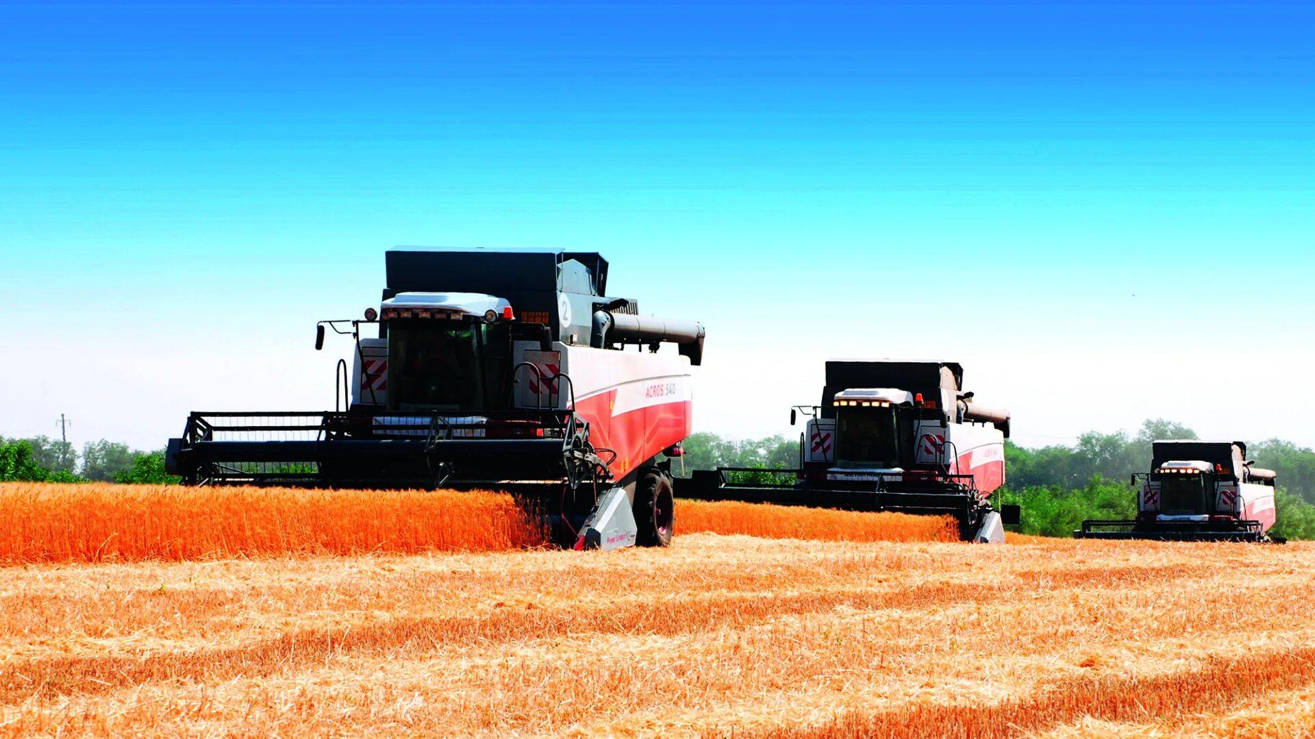 ![Уборка урожая комбайнами]()