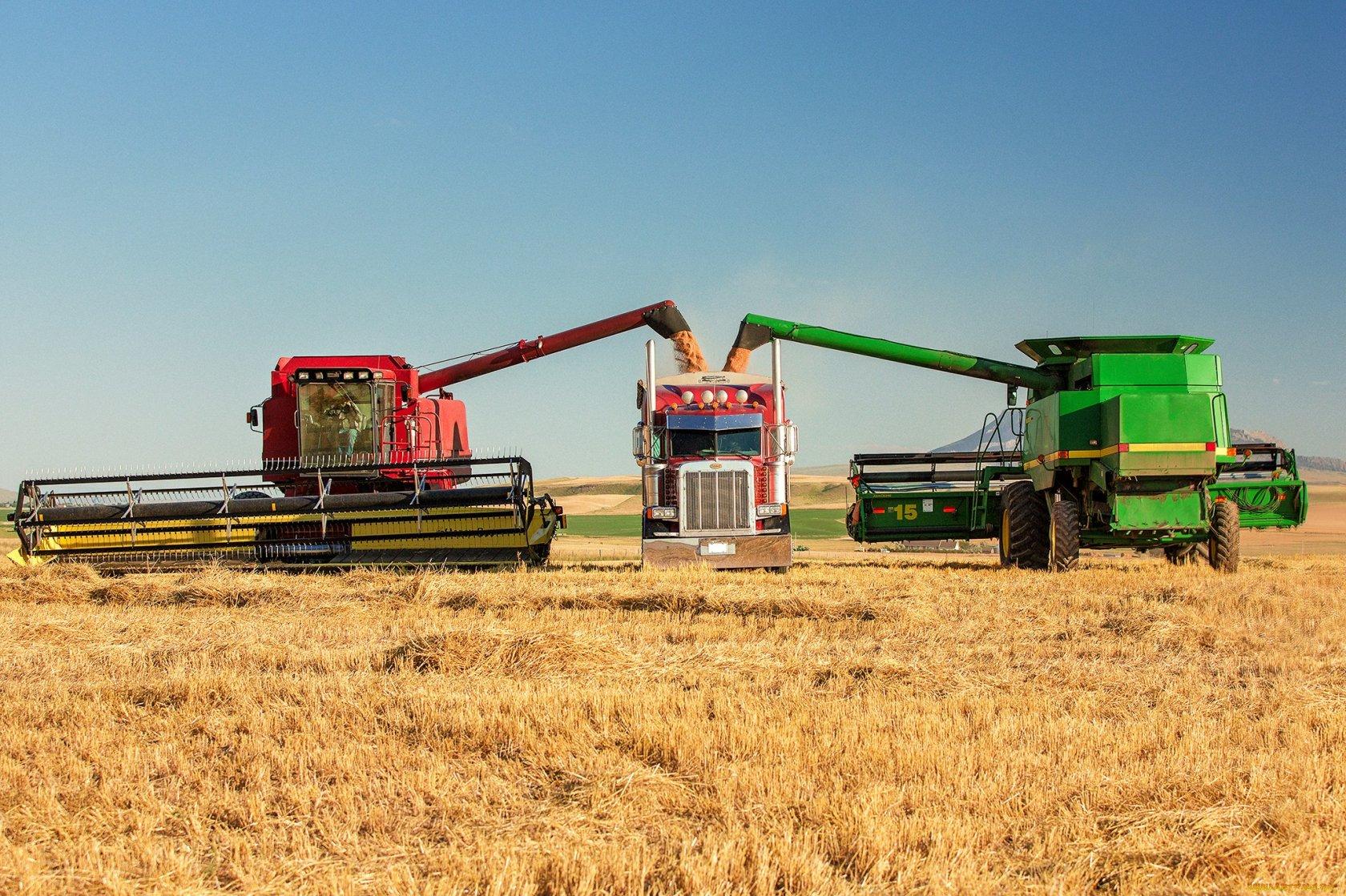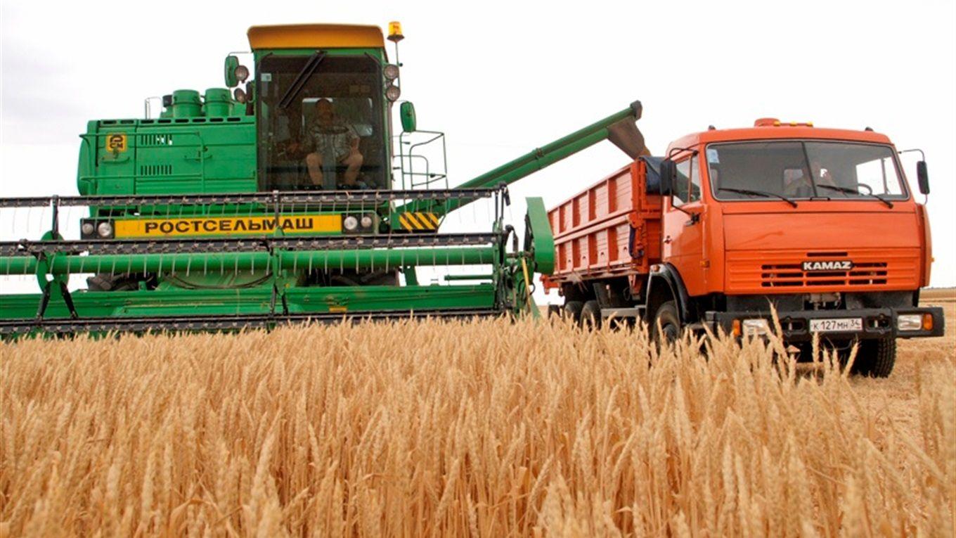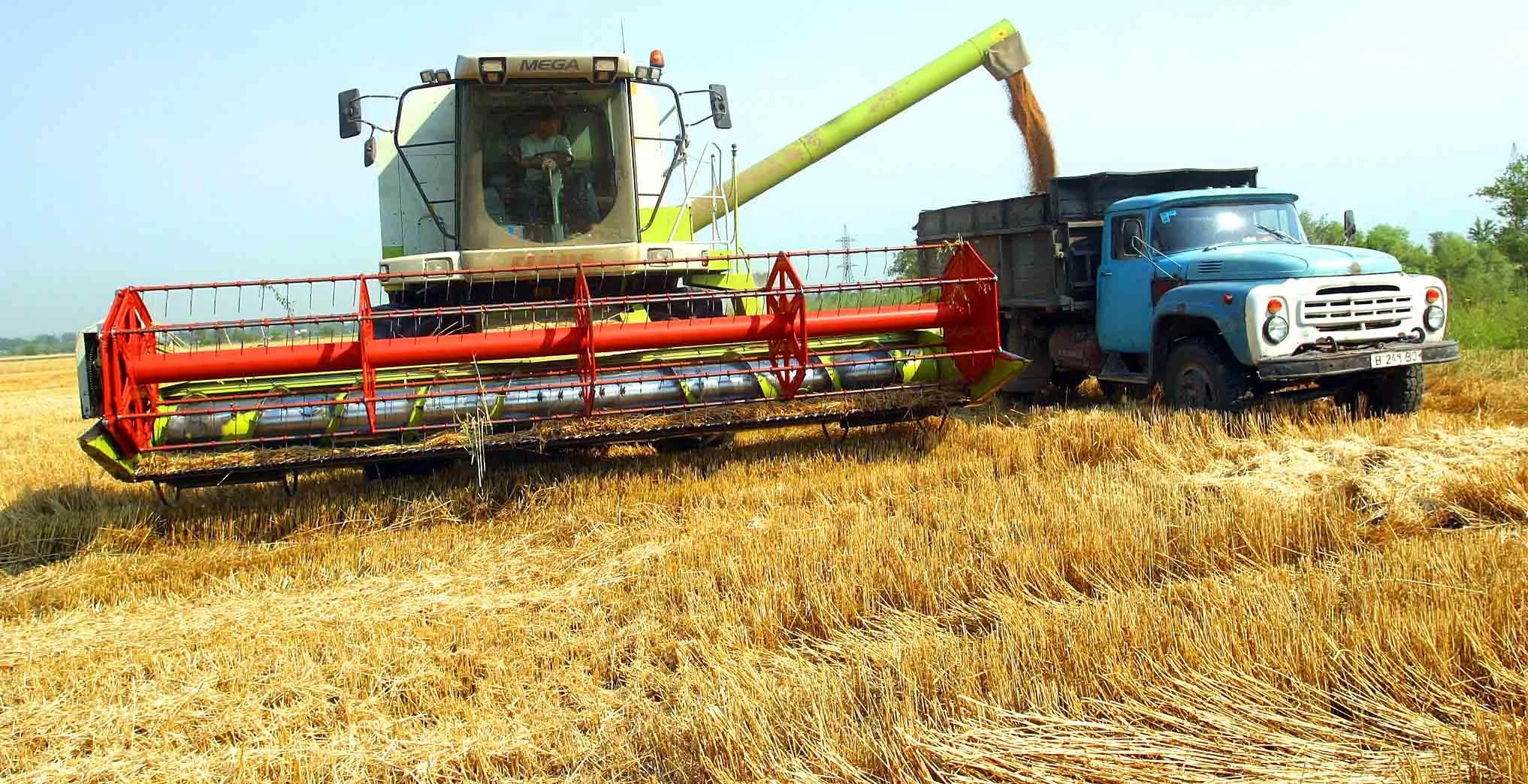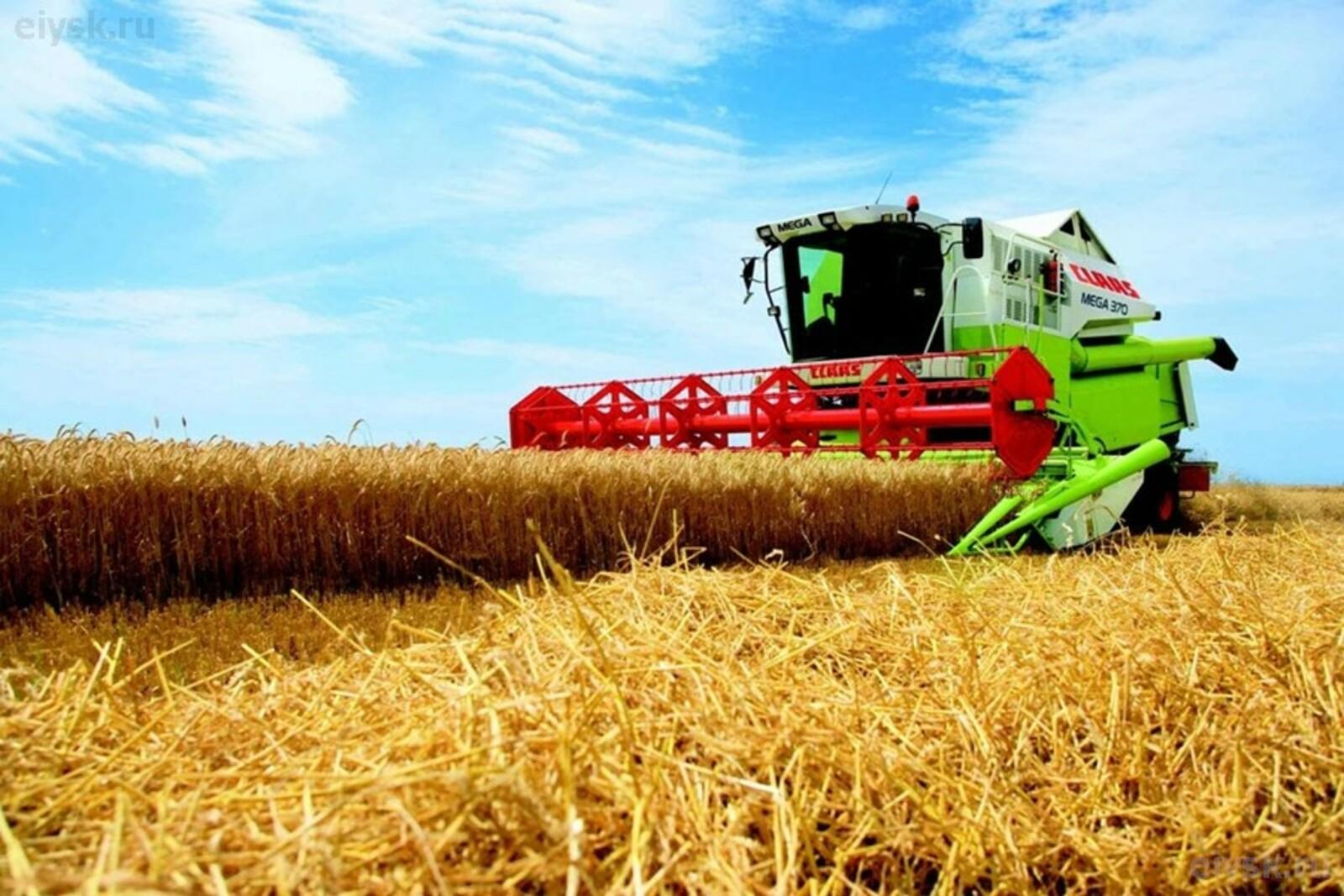 ![Уборка урожая комбайнами]()