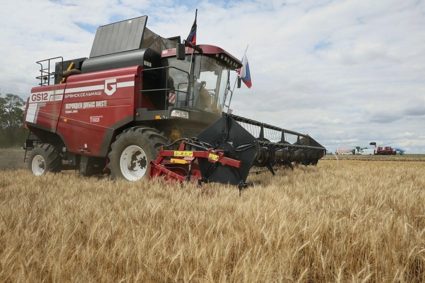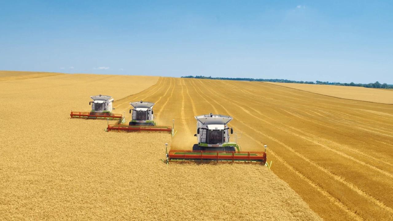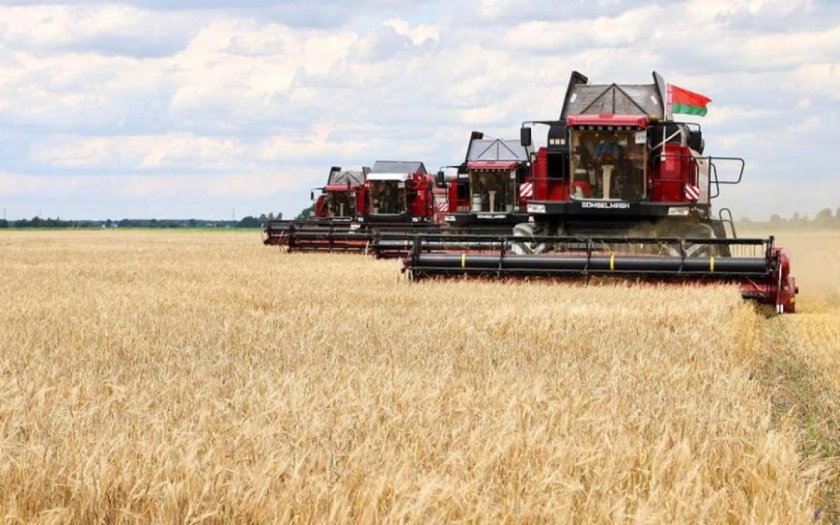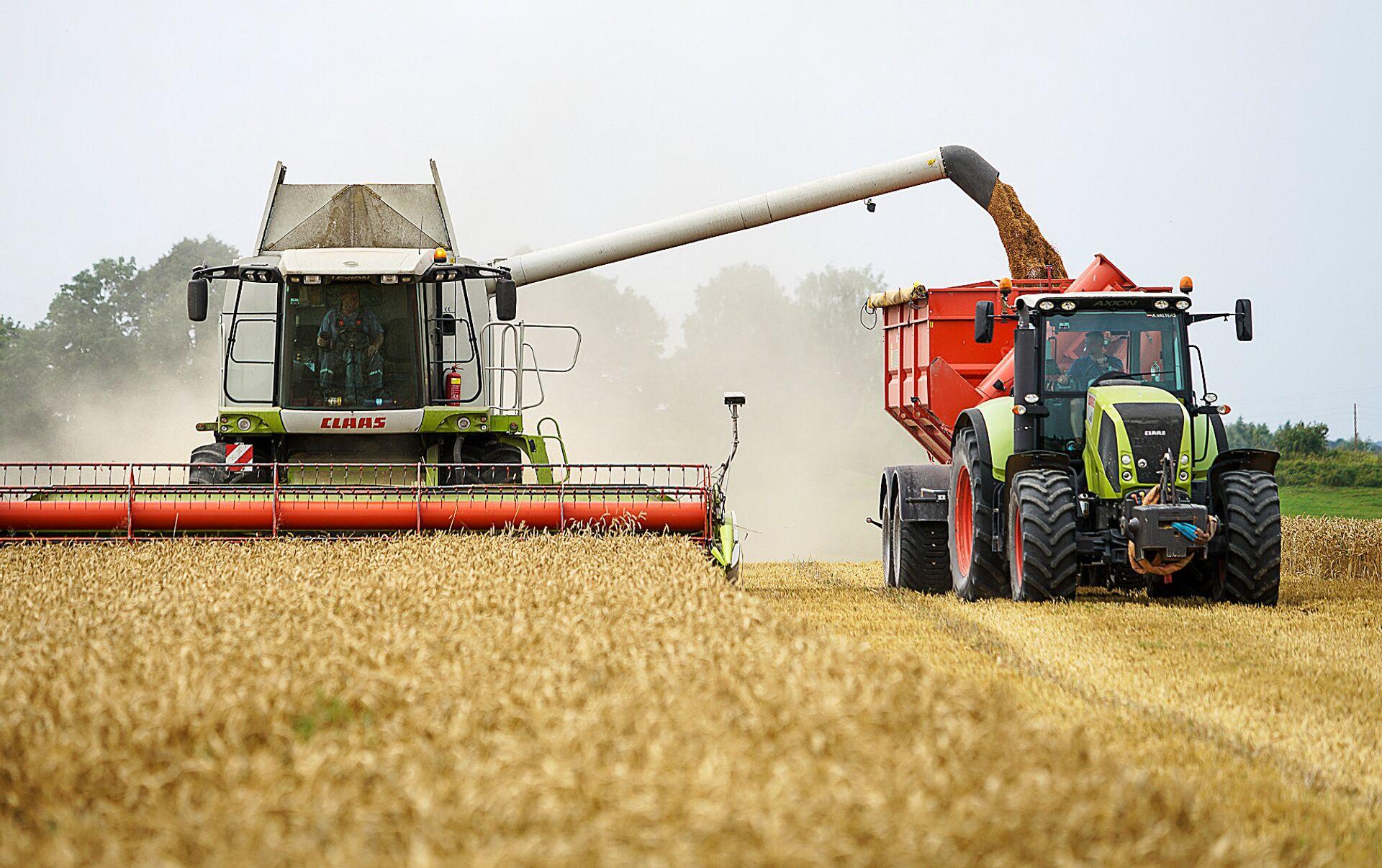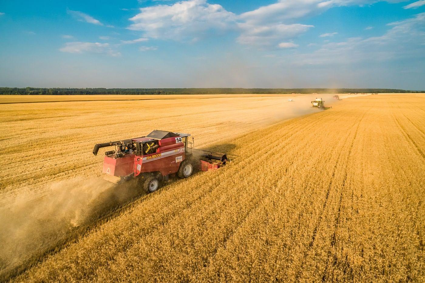 ![Уборка урожая комбайнами]()