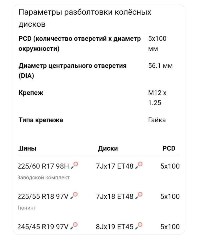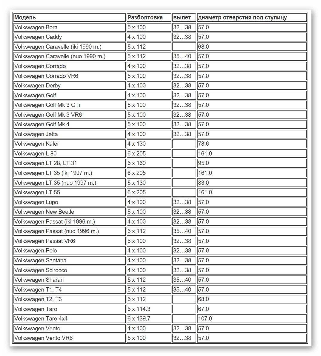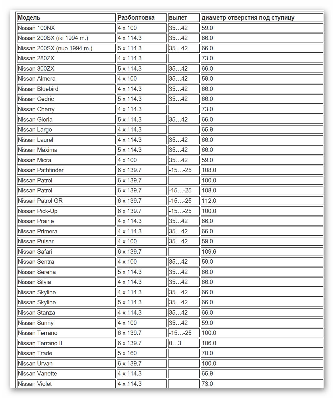 Разболтовка колес таблица