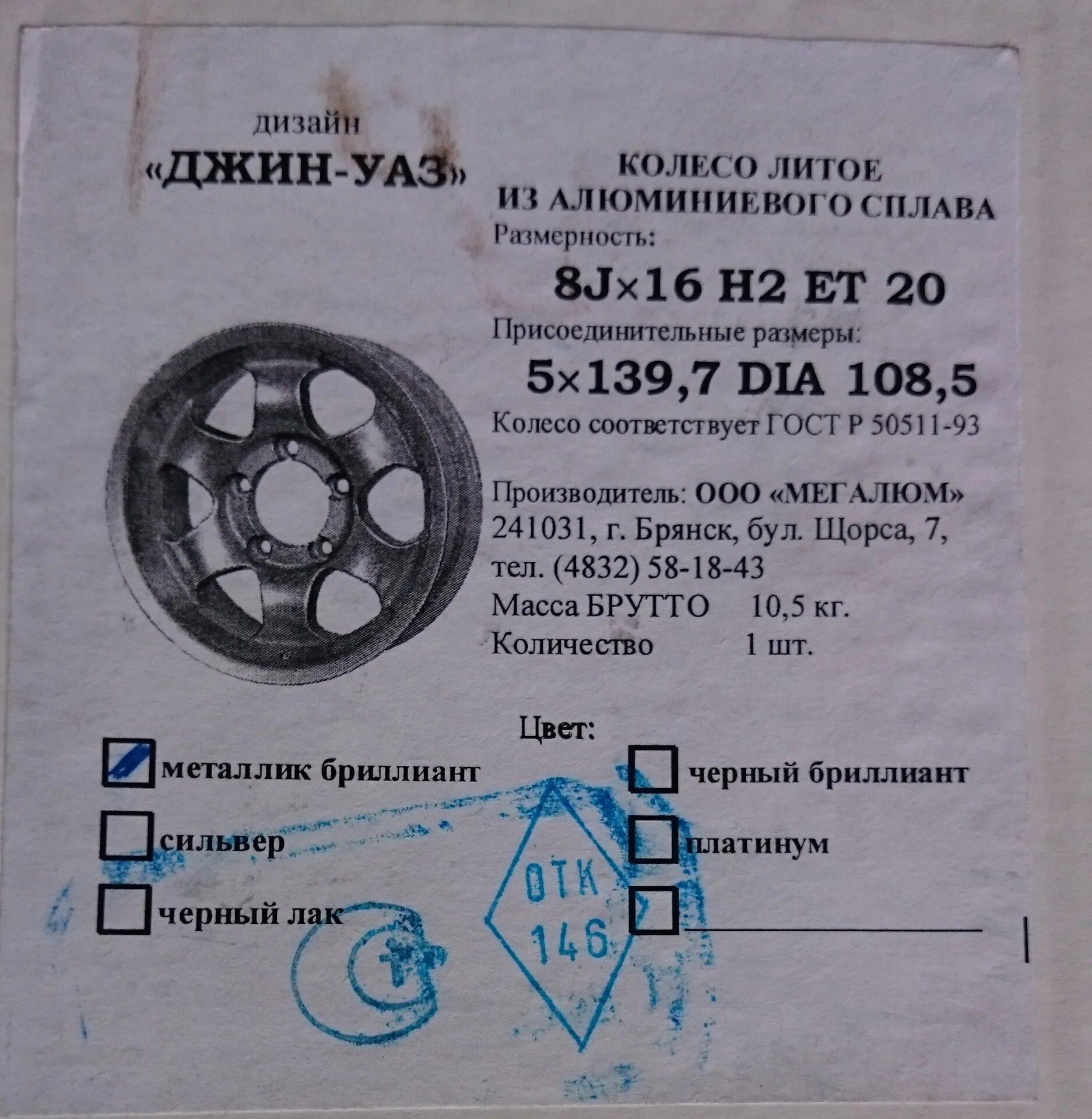 Маркировка дисков для ВАЗ 2110 фирмы MW