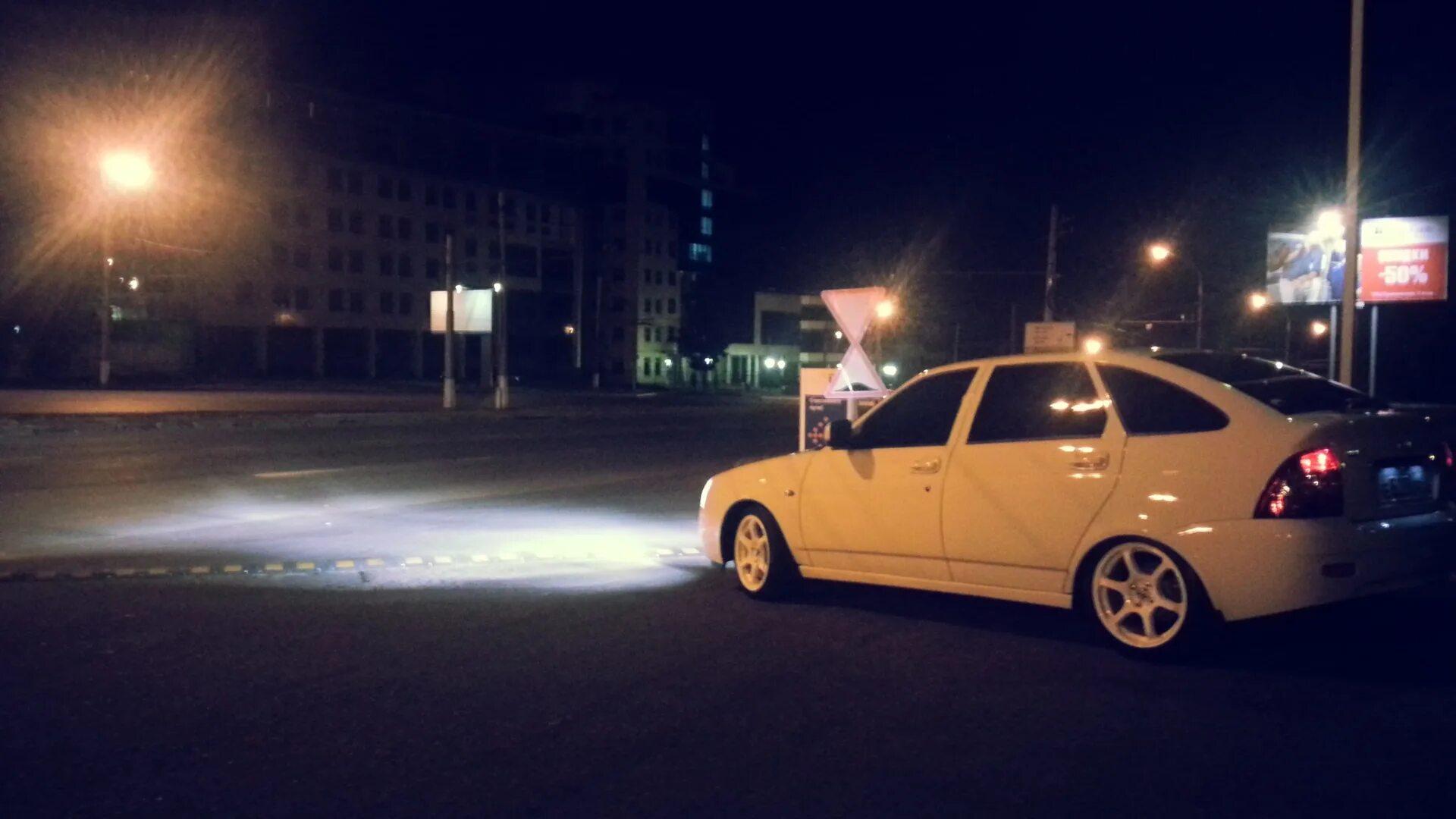 Белая Приора хэтчбек ночью