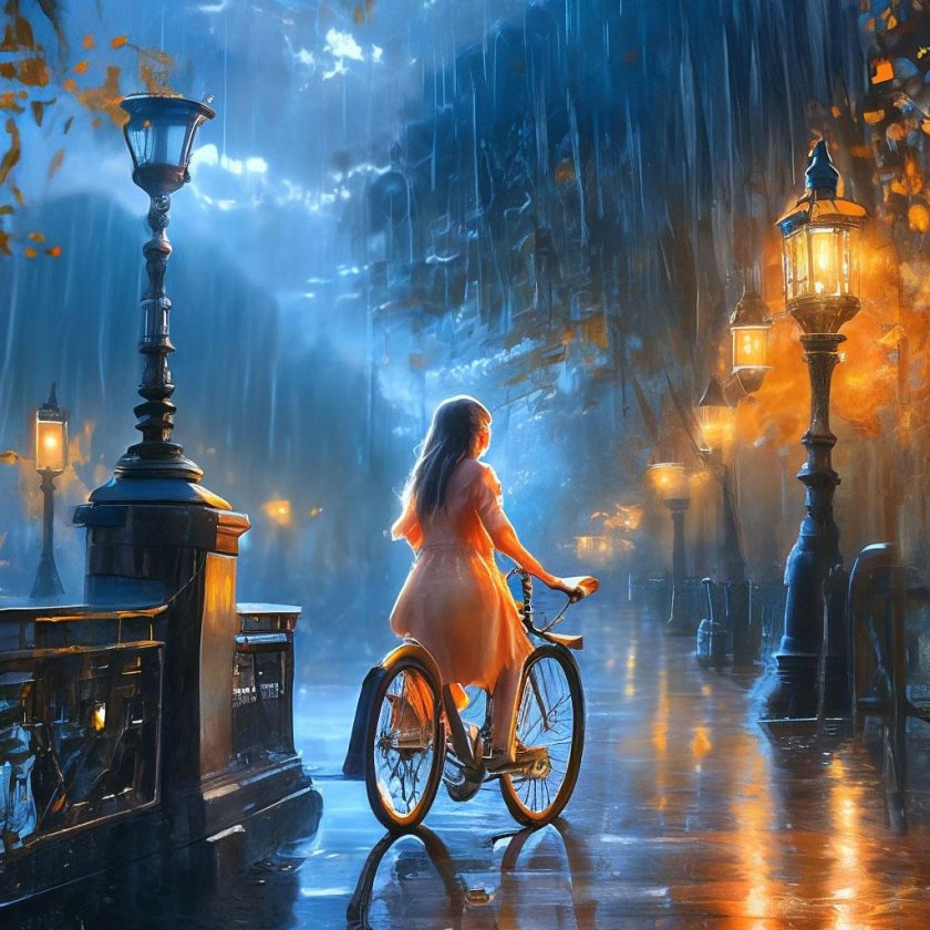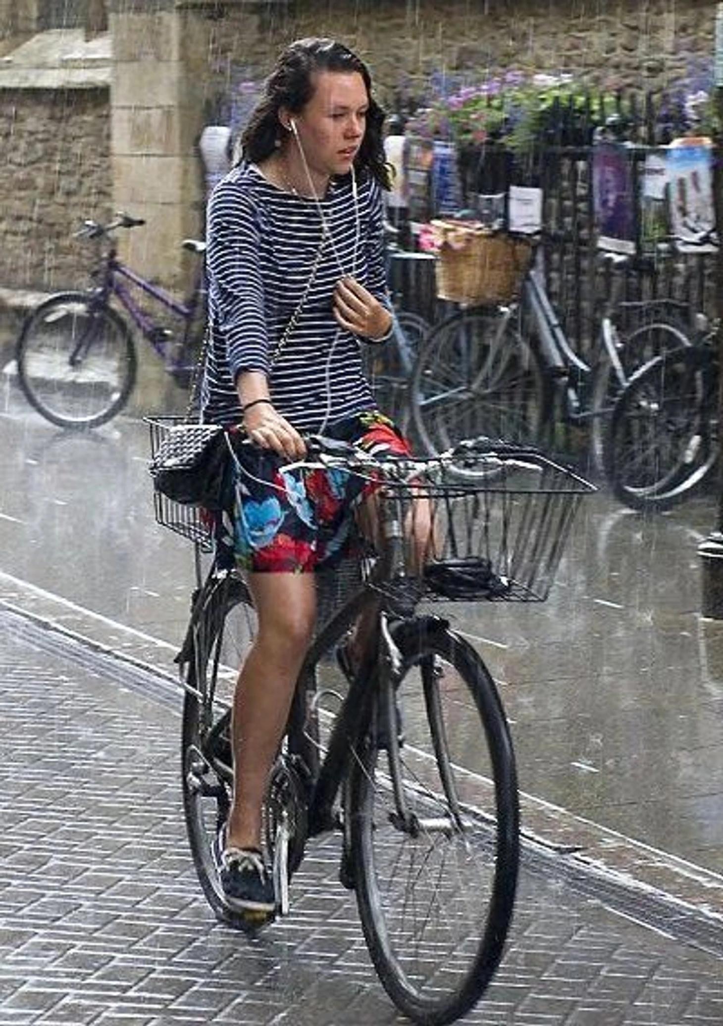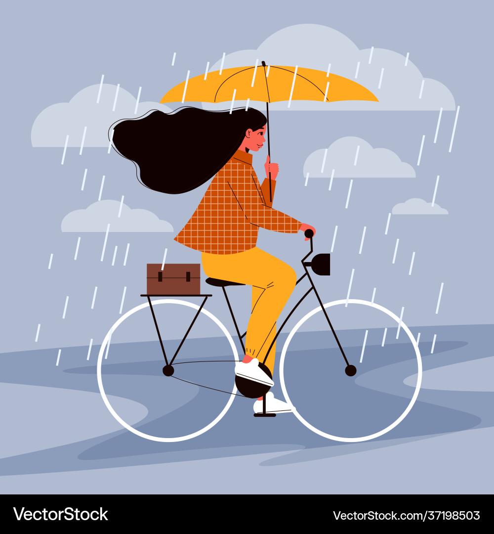 Девушка на велосипеде под дождем