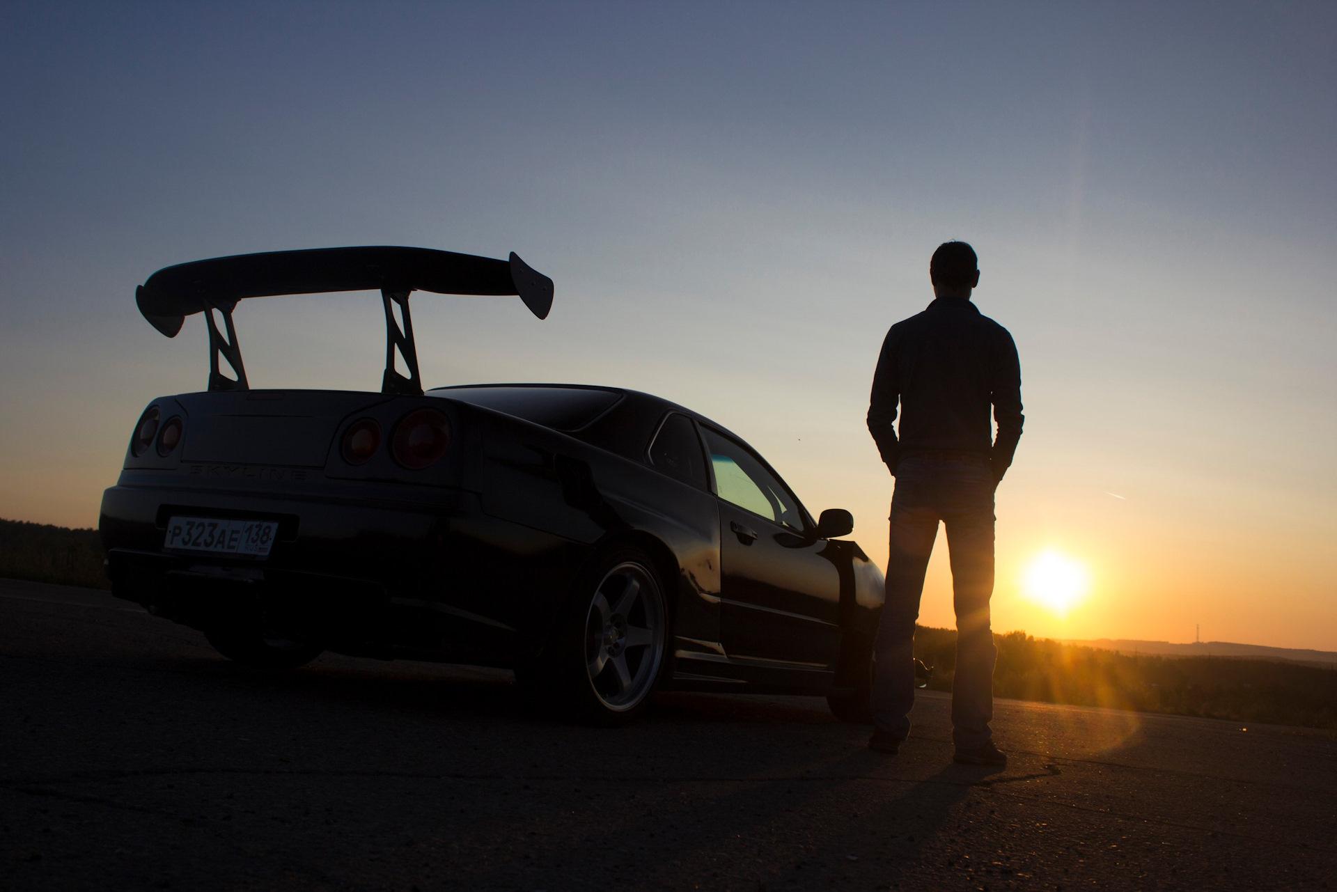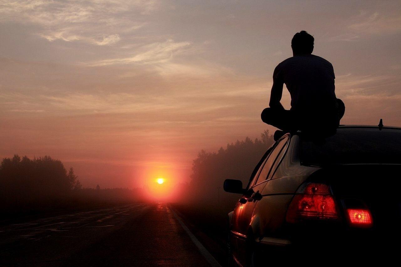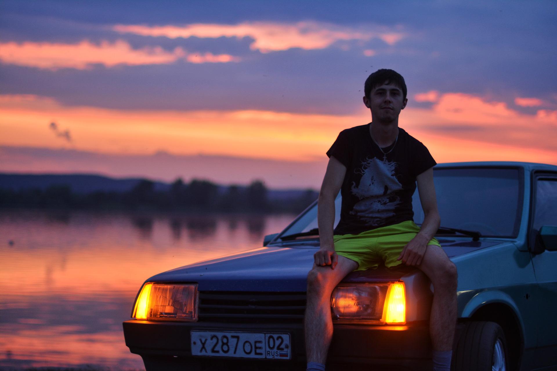 ![Парень с машиной на закате]()