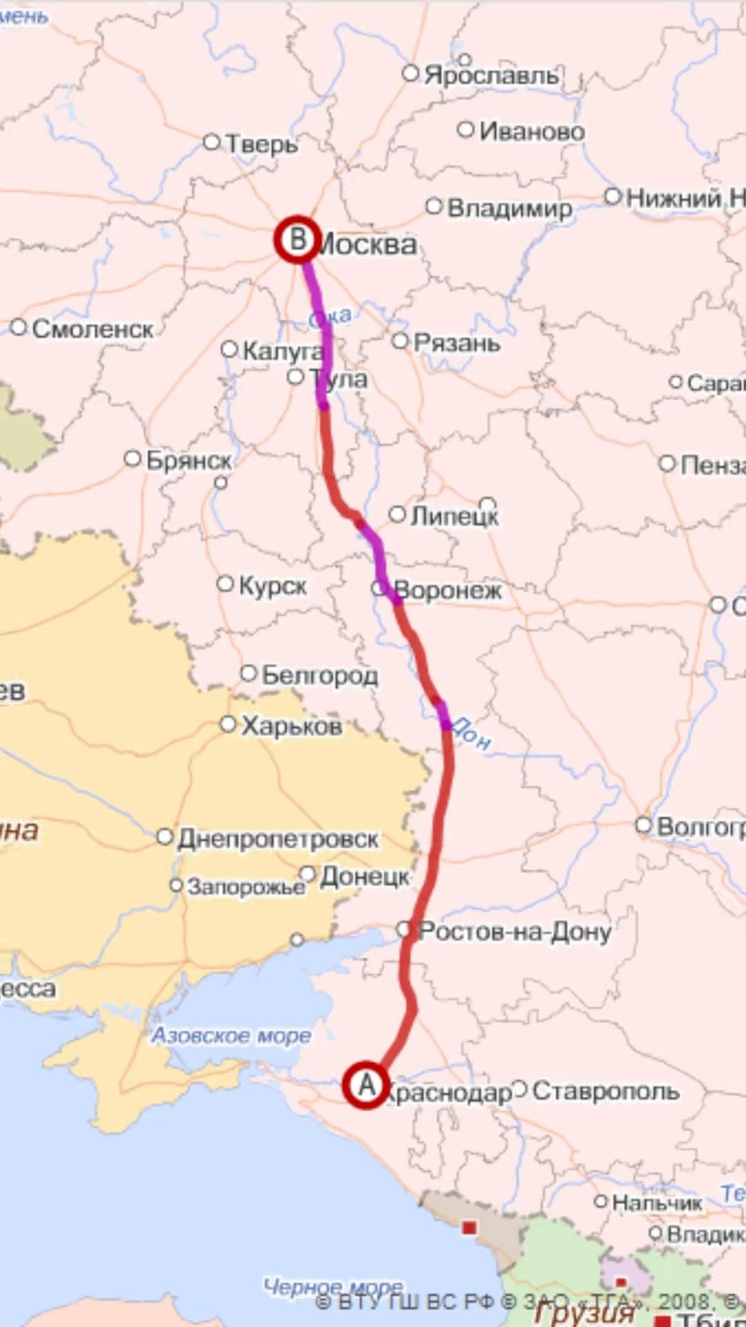 Маршрут поезда 030 Москва Новороссийск с остановками на карте
