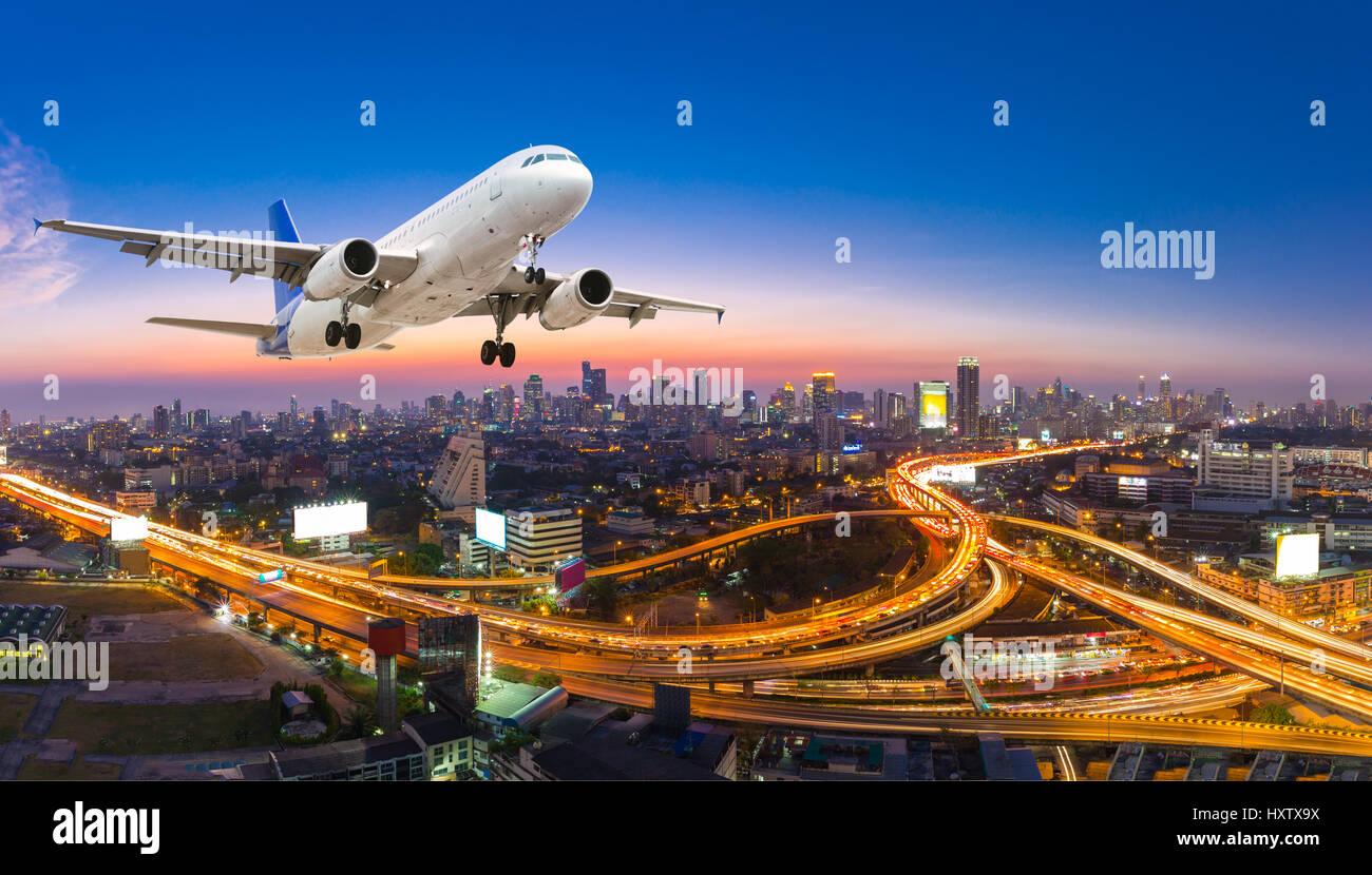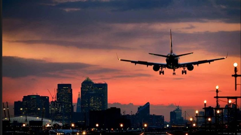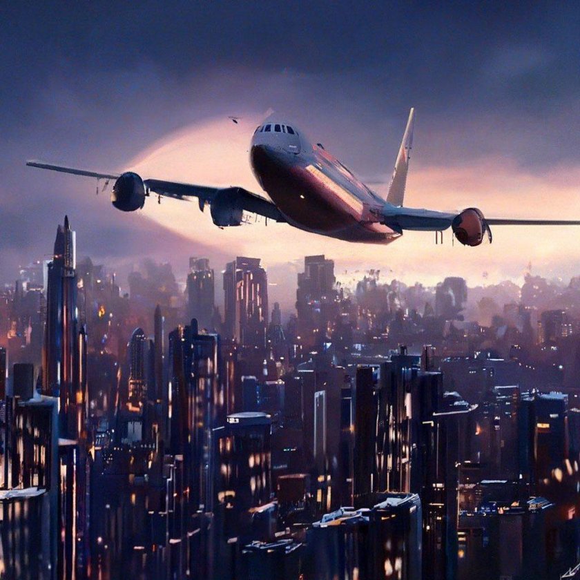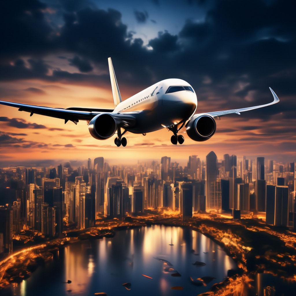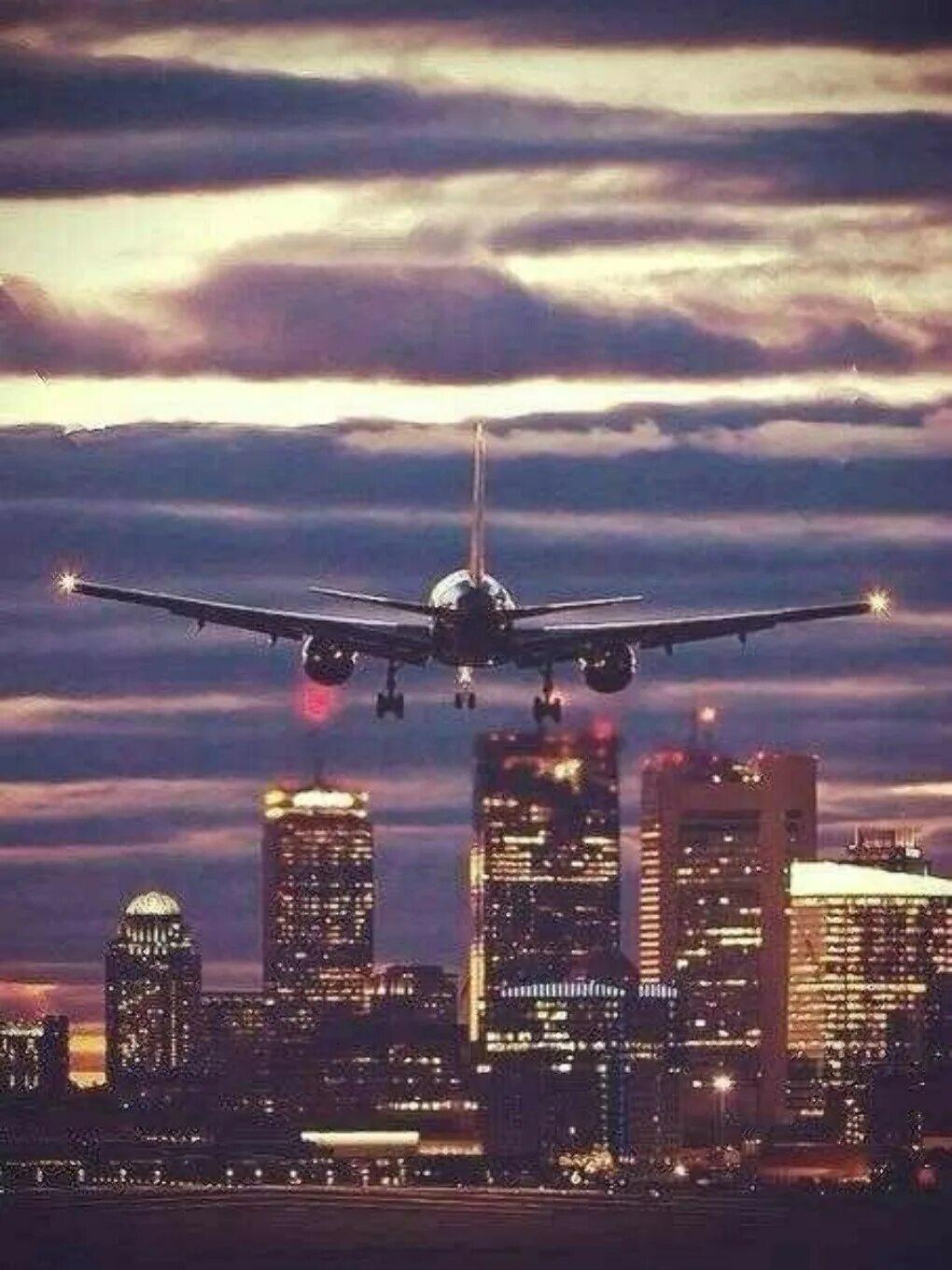 Самолет на закате над городом