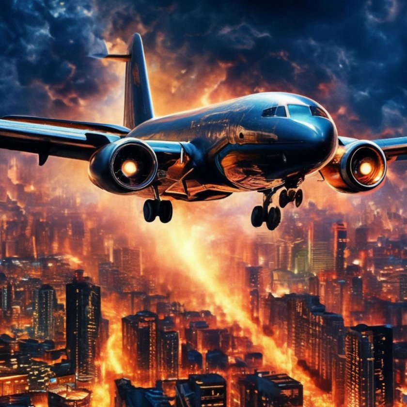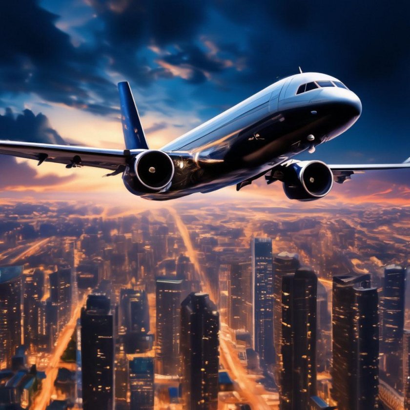Взлетающий самолет над городом